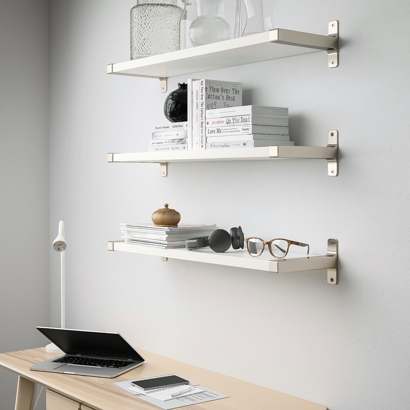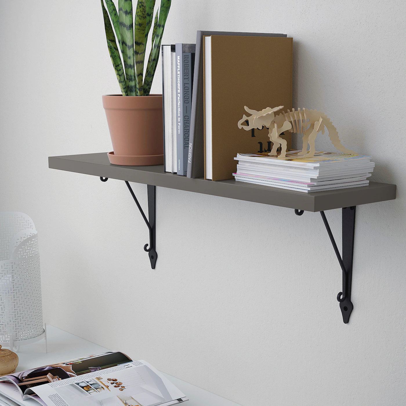 The wall shelf has one bevelled and one smooth edge on the long side, so you can choose the side you want facing the room depending on which of the two different styles you like the most.